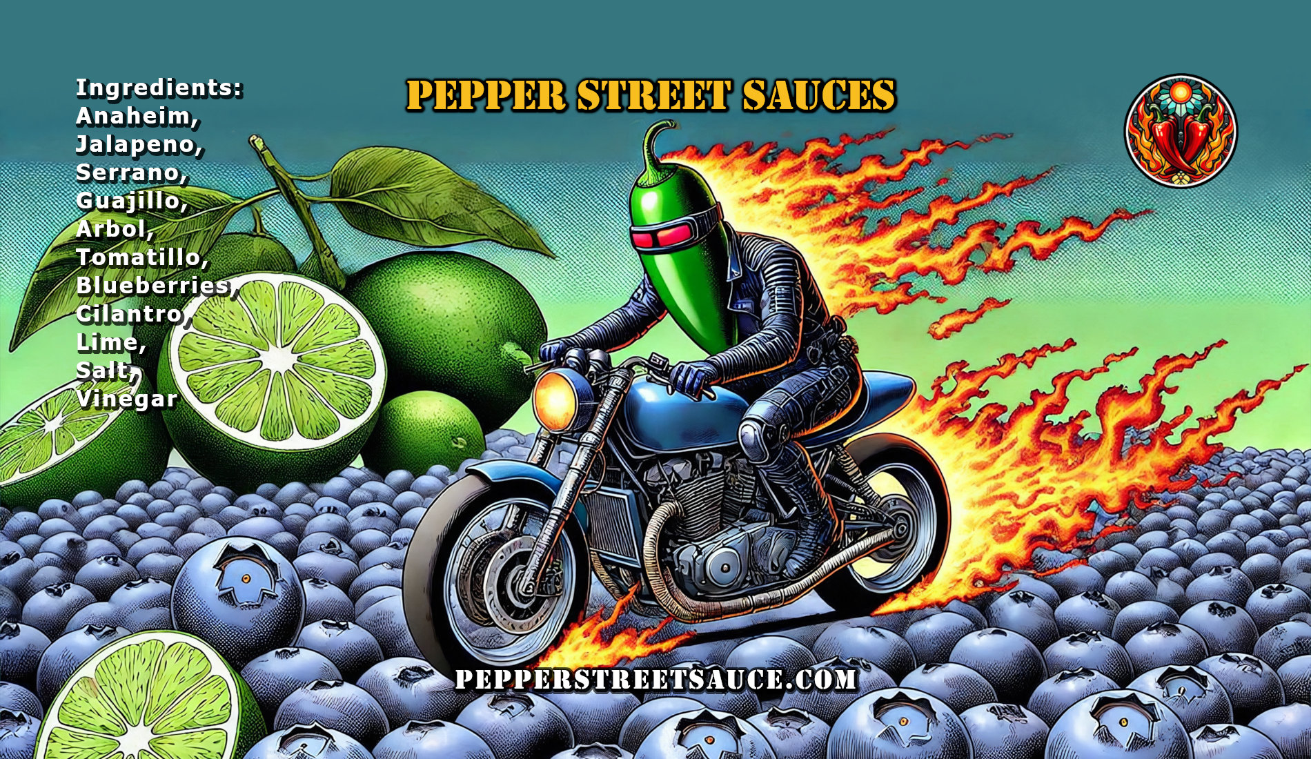 Ingredients: Jalapeno, Serrano, Anaheim, Tomatillo, Guajillo, Blueberry, Cilantro, Lime Salt, Vinegar